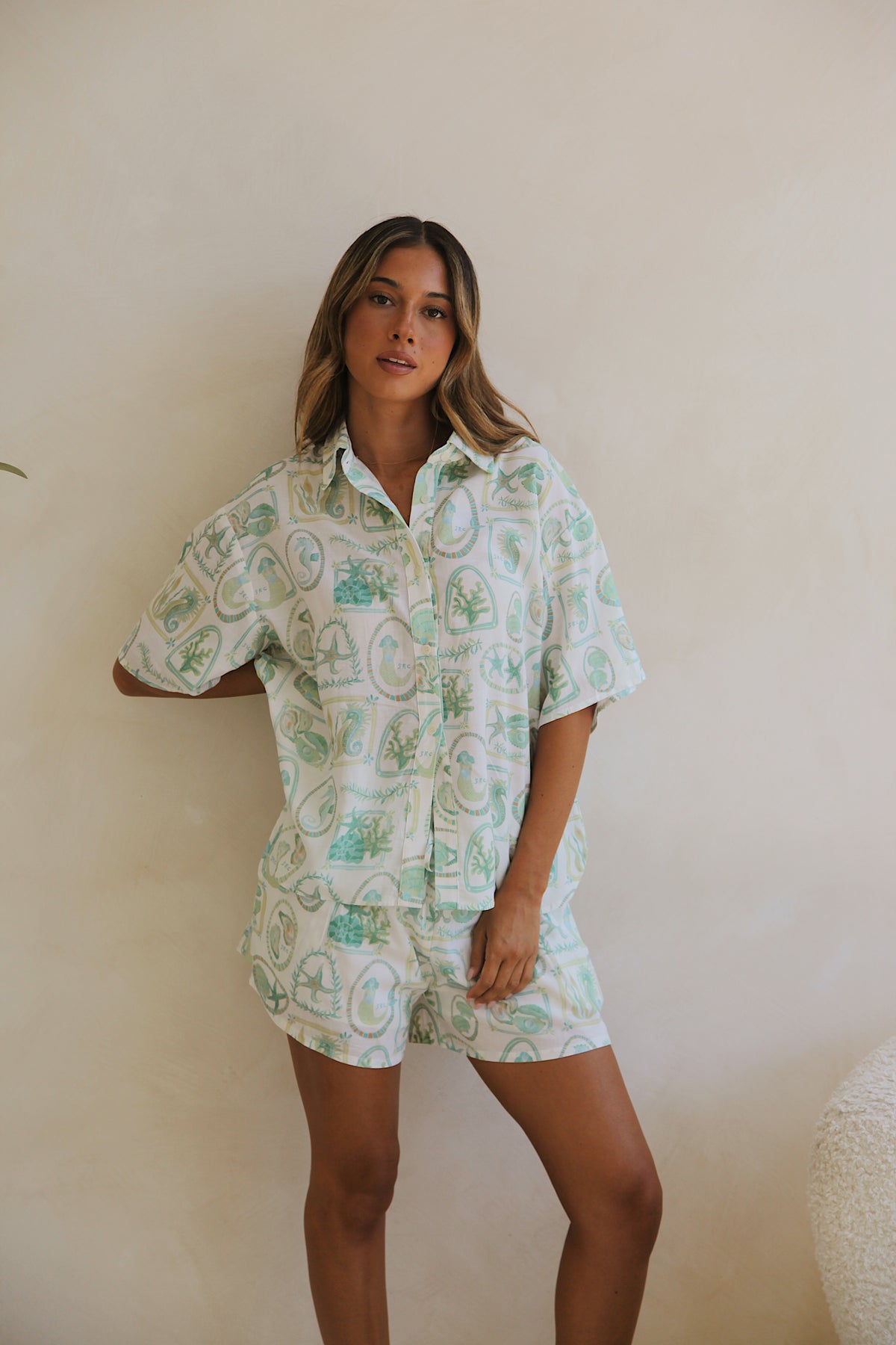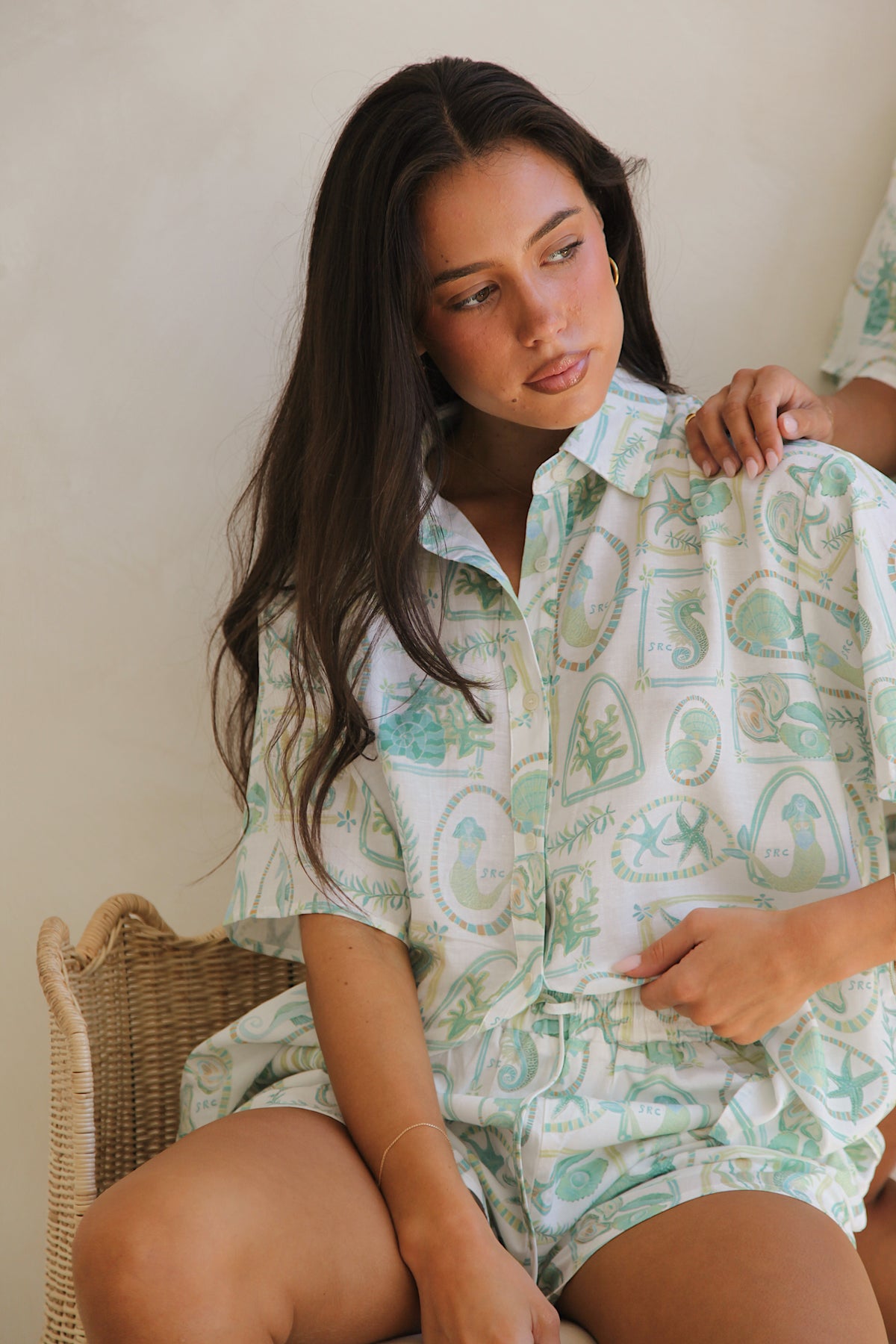 Inspired by salt-kissed air and long summer afternoons, the linen shirt in our Paradiso print captures the ease of sun-drenched coastal living. The exclusive hand-painted artwork features ocean-inspired motifs in soft green and blue tones — nostalgic, refined, and made for warm days that drift into golden evenings.