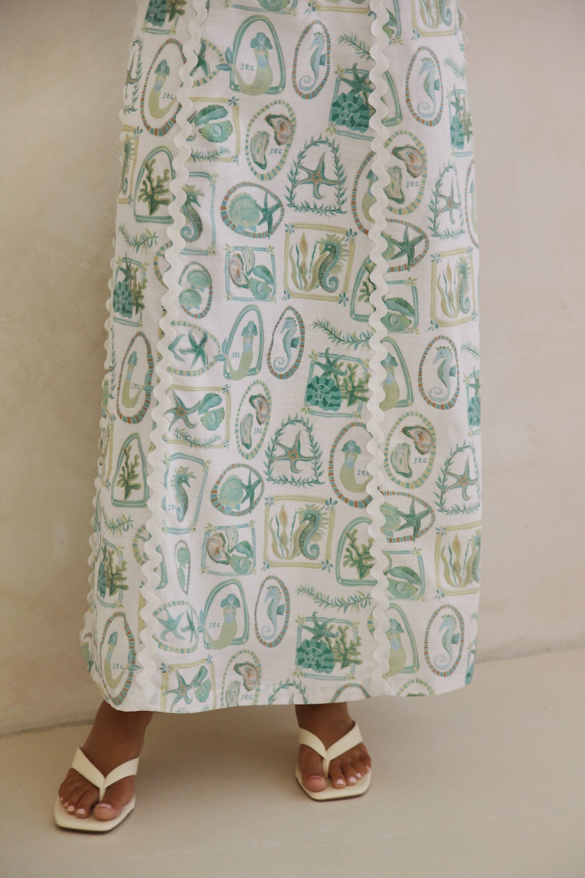 Inspired by salt-kissed air and long summer afternoons, the Maya maxi dress in our Paradiso print captures the ease of sun-drenched coastal living. The exclusive hand-painted artwork features ocean-inspired motifs in soft green and blue tones — nostalgic, refined, and made for warm days that drift into golden evenings.