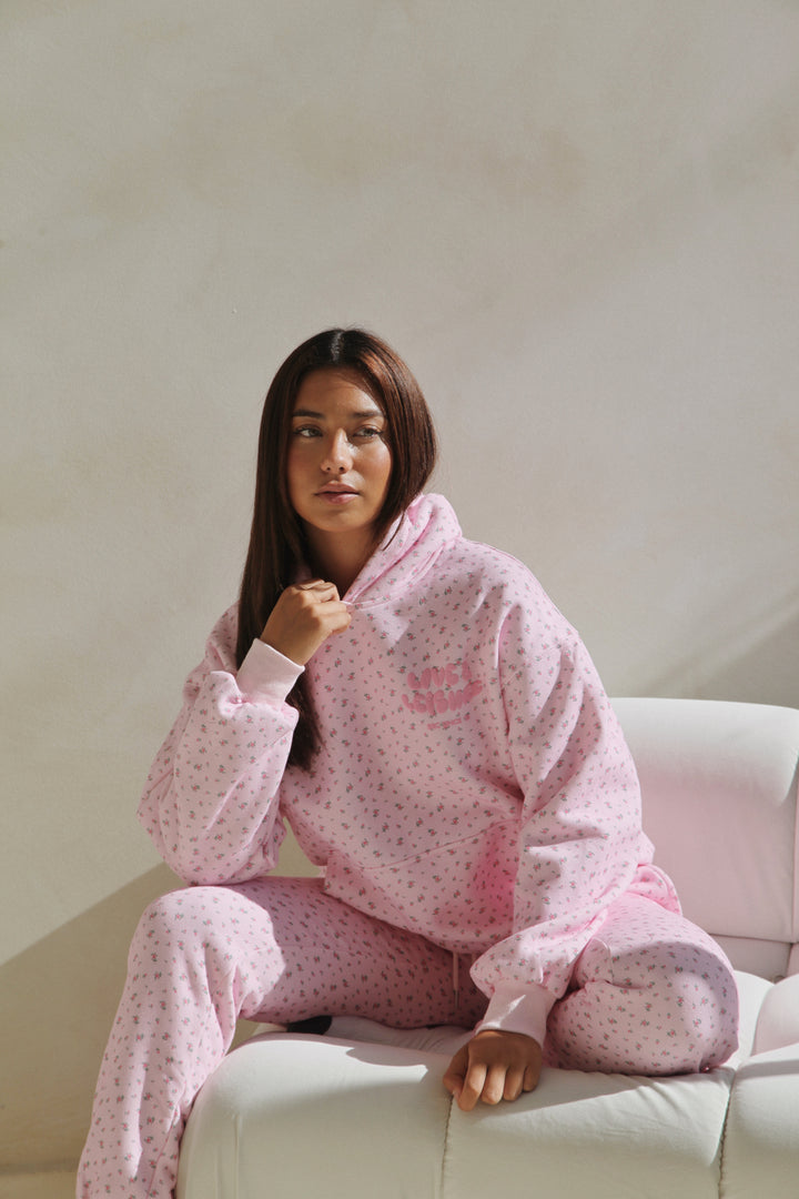 Experience unparalleled comfort with our Essential Lounge Hoodie, crafted to redefine your relaxation moments. This hoodie is made from ultra-soft, high-quality fleece and features our distinctive Love & Leisure puff print logos for elite, trending style. The design includes a large front pocket for convenience and warmth, soft hood, ribbed cuffs and waistband. It features an exclusive, custom printed floral design that has been hand drawn by a talented Australian artist.