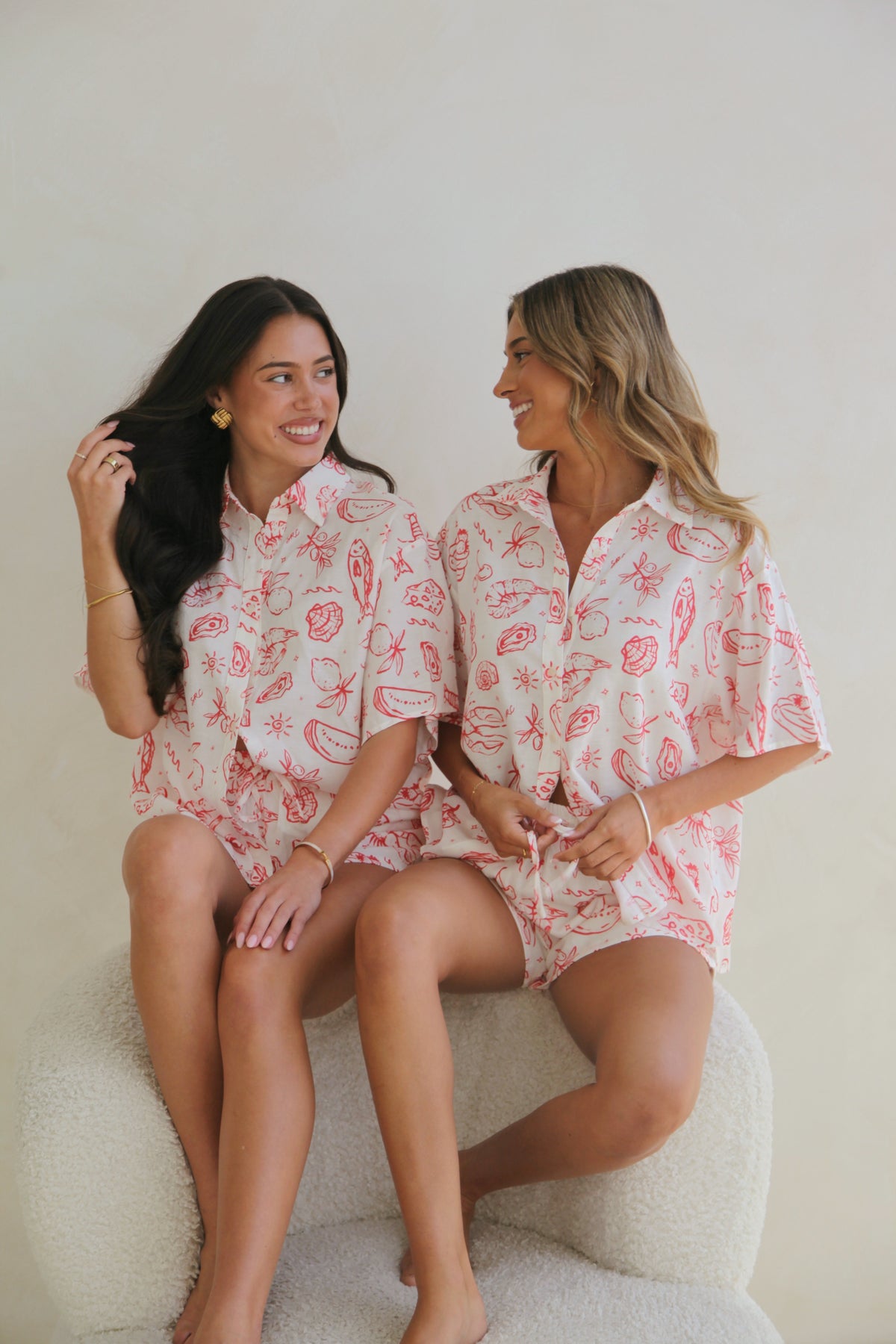 Custom printed in our exclusive coastal banquet-inspired design, featuring red summer motifs on an off-white base, this timeless piece pairs elevated style with ease. The shirt features a structured collar, boxy sleeves, and a button-down front, making it effortlessly versatile. Style it with the matching linen shorts to complete the look.